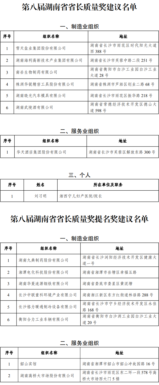 第八屆湖南省省長質量獎及提名獎建議名單公示