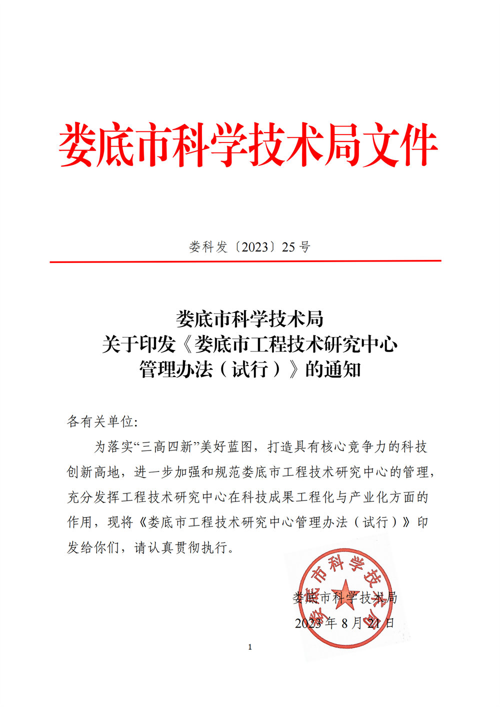 婁底市科學技術局關于印發(fā)《婁底市工程技術研究中心管理辦法(試行)》的通知