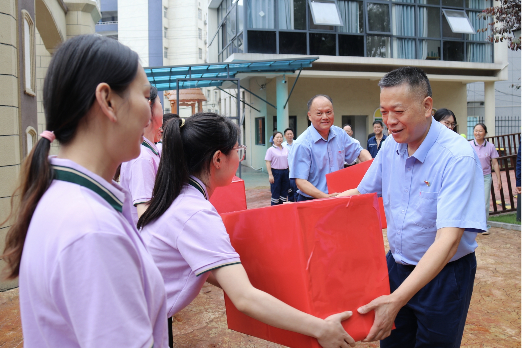 慰問活動前,領(lǐng)導們參觀了學校的校園環(huán)境,深入了解了學校的硬件設(shè)施和教學條件,感受著學校豐富多彩的校園文化和濃厚的節(jié)日氛圍。 每走進一間教室,領(lǐng)導們都親切地與孩子們互動交流,為每一個孩子送上精心準備的節(jié)日禮物, 并祝愿他們“六一”兒童節(jié)快樂、健康茁壯成長。