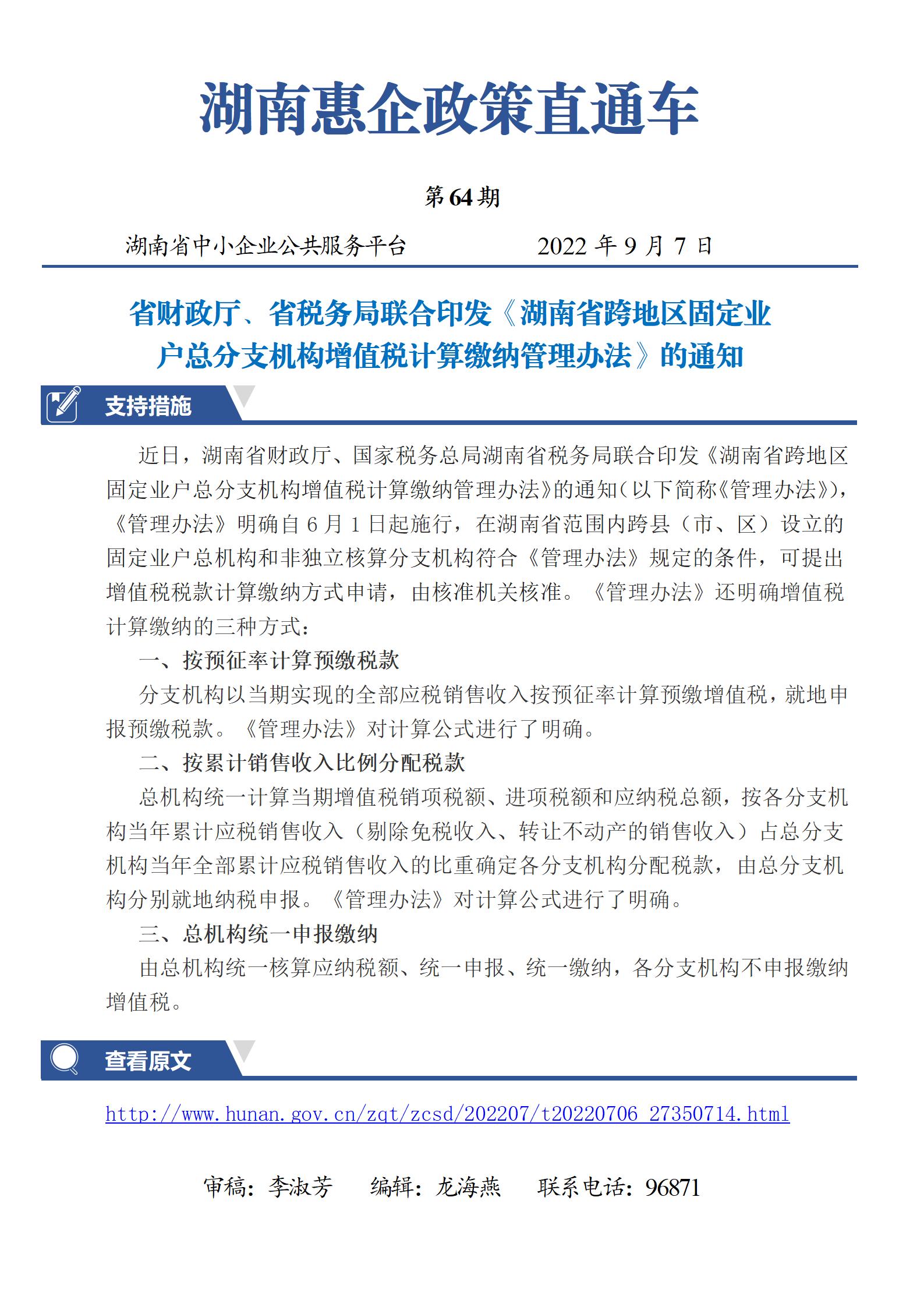 省財(cái)政廳、省稅務(wù)局聯(lián)合印發(fā)《湖南省跨地區(qū)固定業(yè)戶總分支機(jī)構(gòu)增值稅計(jì)算繳納管理辦法》的通知