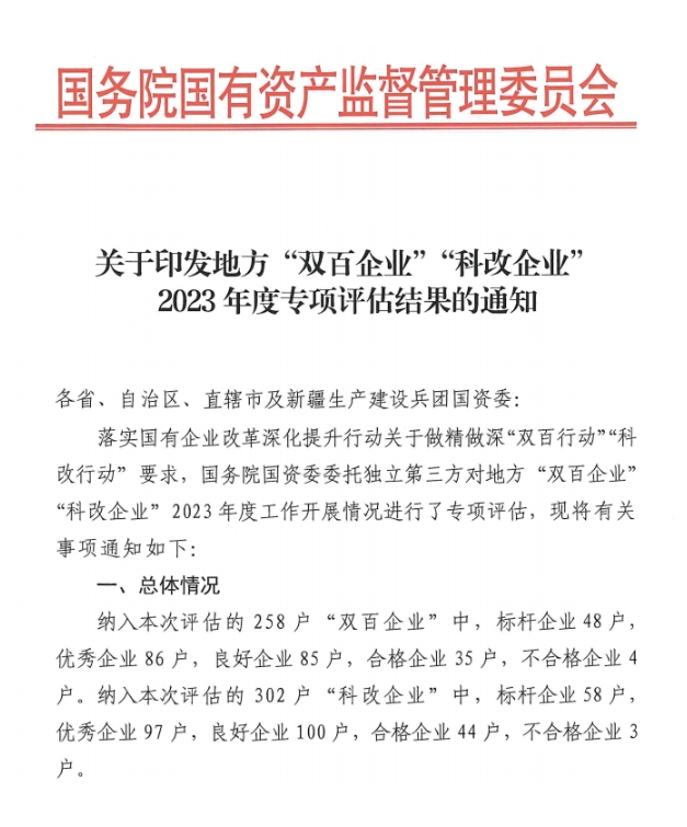 據(jù)了解,“科改企業(yè)”專項評估每年進(jìn)行一次,旨在落實國有企業(yè)改革深化提升行動關(guān)于做精做深“科改行動”要求。本次國務(wù)院國資委委托獨立第三方對地方“科改企業(yè)”2023年度工作開展情況進(jìn)行了專項評估,考核結(jié)果按照得分高低分為標(biāo)桿、優(yōu)秀、良好、合格、不合格五個等級,考核內(nèi)容涉及企業(yè)科技創(chuàng)新、體制機(jī)制、綜合成效等方面共計47項指標(biāo),全面權(quán)威地反應(yīng)了企業(yè)在加快科技新成果轉(zhuǎn)化、提升自主創(chuàng)新能力等方面的舉措和成果。