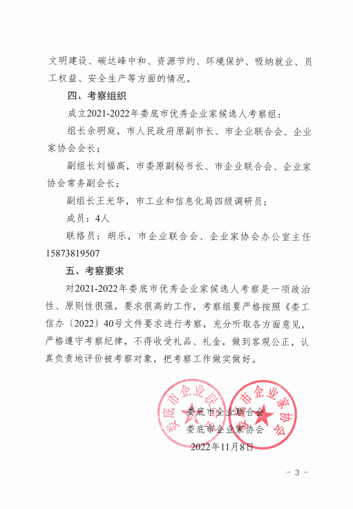 關(guān)于對2021-2022年婁底市優(yōu)秀企業(yè)家候選人實地考察的通知