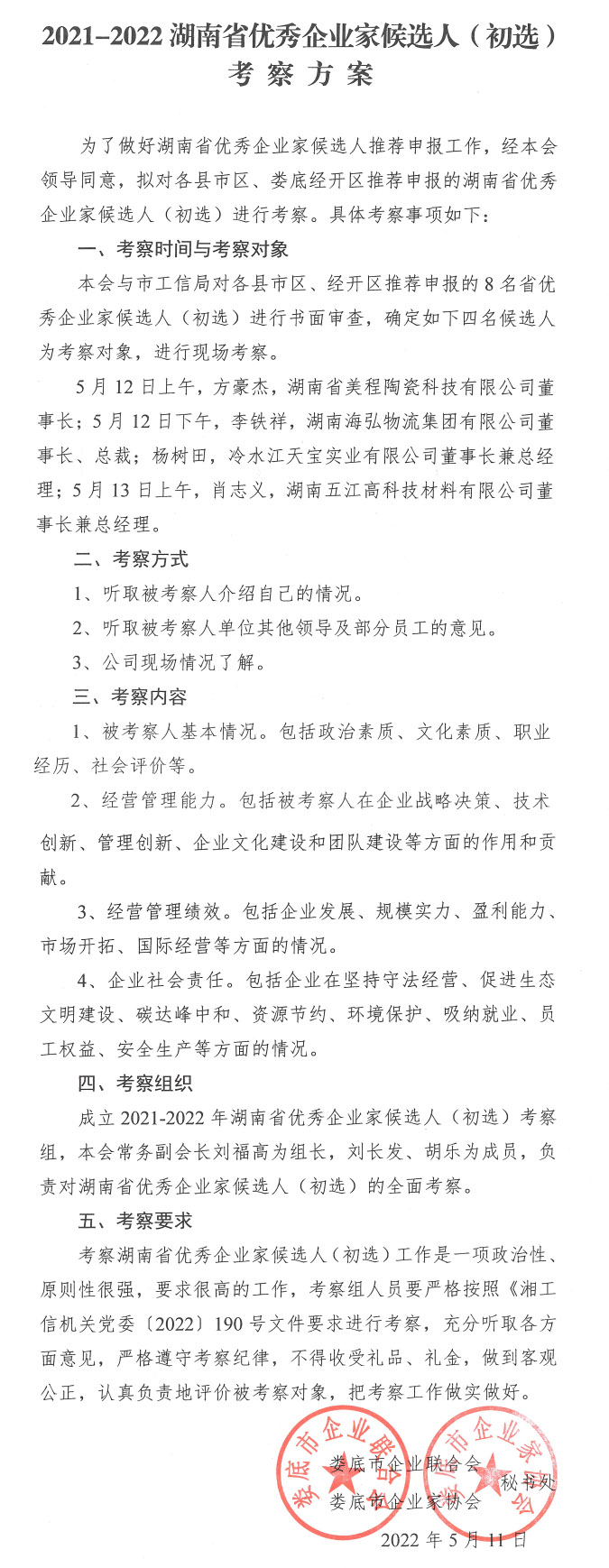 2021-2022湖南省優(yōu)秀企業(yè)家候選人(初選)考察方案