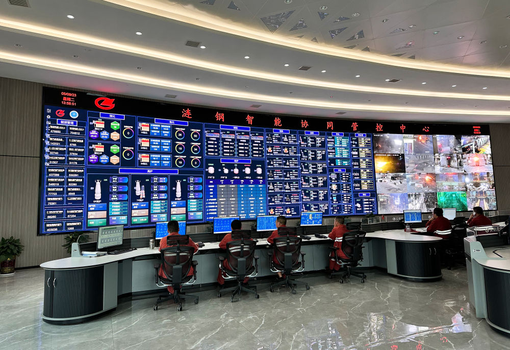 在漣鋼智能協(xié)同管控中心,LED屏幕上躍動(dòng)著煉鋼環(huán)節(jié)的各項(xiàng)數(shù)據(jù)參數(shù)和生產(chǎn)一線的實(shí)時(shí)畫面,技術(shù)工人正在監(jiān)測分析生產(chǎn)動(dòng)態(tài)信息。