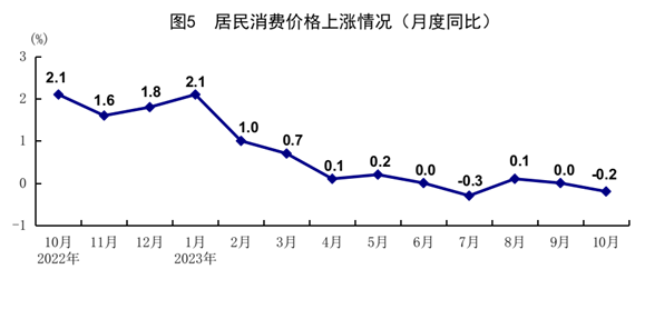 10月份,全國(guó)居民消費(fèi)價(jià)格(CPI)同比下降0.2%,環(huán)比下降0.1%。分類別看,食品煙酒價(jià)格同比下降2.1%,衣著價(jià)格上漲1.1%,居住價(jià)格上漲0.3%,生活用品及服務(wù)價(jià)格下降0.6%,交通通信價(jià)格下降0.9%,教育文化娛樂價(jià)格上漲2.3%,醫(yī)療保健價(jià)格上漲1.3%,其他用品及服務(wù)價(jià)格上漲3.6%。在食品煙酒價(jià)格中,豬肉價(jià)格下降30.1%,鮮菜價(jià)格下降3.8%,糧食價(jià)格上漲0.6%,鮮果價(jià)格上漲2.2%??鄢称泛湍茉磧r(jià)格后的核心CPI同比上漲0.6%。1-10月份,全國(guó)居民消費(fèi)價(jià)格同比上漲0.4%